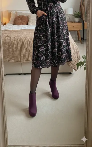 Botines de tacón alto con plataforma en color morado - Material exterior tipo ante. - Cierre con cremallera lateral. - Tacón fino y plataforma delantera. - Puesto 1 vez - Tiene un poco despellejado en el interior. EXTERIOR PERFECTO.