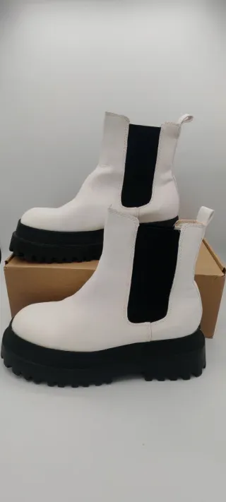 Botines blancos con suela de plataforma. - Diseño moderno y cómodo. - Material sintético. - Tacón grueso. Botines blancos son ajustados no tienen cremallera talla 38 de Stradivarius. Las manchas que se aprecia no se quitarlas. Son cómodos