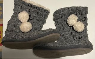 Botines tipo zapatillas de invierno de Oysho. Son muy calentitas y cómodas para estar en casa. - Tejido de punto gris con detalles calados. - Forro interior suave y mullido. - Adorno de dos pompones beige en cada botín. - Suela antideslizante.