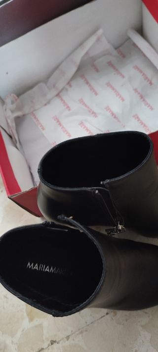 Botines elegantes de la marca Maria Mare. - Diseño moderno con cremallera lateral. - Detalle de ojales metálicos en el lateral. - Tacón de bloque para mayor comodidad. - Punta abierta.