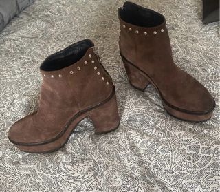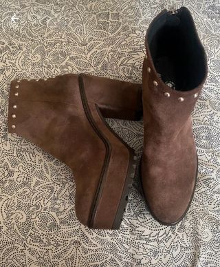 Botines de ante con tachuelas metálicas. - Diseño de plataforma. - Tacón grueso. - Cierre de cremallera en la parte trasera.