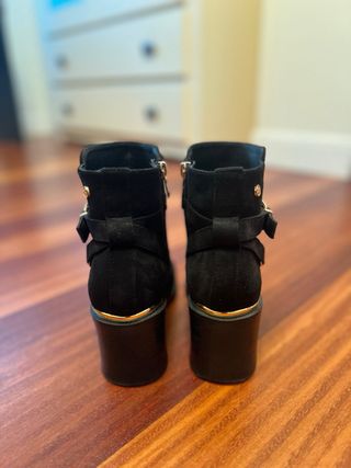 Botines de tacón alto con un diseño moderno y elegante. - Material exterior de ante. - Correa con hebilla dorada. - Cierre de cremallera lateral. - Tacón grueso para mayor comodidad.