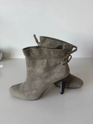 Botines de ante en color gris con un diseño elegante y un detalle de lazo en la parte trasera. - Tacón de aguja. - Material: Ante. - Cierre: Lazo en la parte trasera.