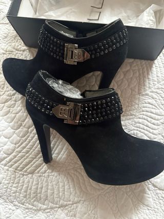 Preciosos botines de tacón alto de la marca VictoriaDelef. Presentan un diseño elegante con detalles de pedrería. Ideales para ocasiones especiales. - Material: ante. - Tacón alto y fino. - Cierre de cremallera. - Detalles de pedrería negra. Atención: aunque son de l talla 37 son super estrechos y por eso no los he podido estrenar. Quedarian mejor en las que usen una 36.