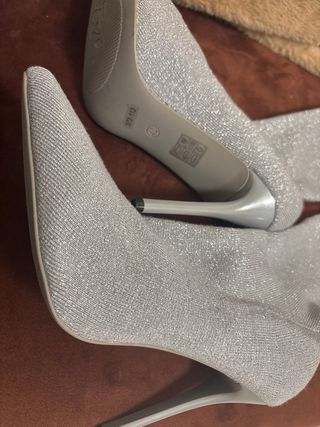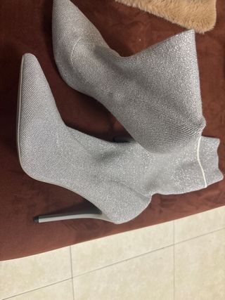 Botines de tacón con un diseño moderno y brillante. - Acabado plateado. - Tacón fino y elegante. - Material elástico para un ajuste cómodo. - Da un 39