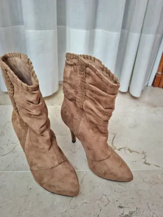 Botines de tacón con un diseño moderno y elegante. - Material: Ante. - Color: Marrón/Beige. - Detalle trenzado en la caña. - Punta fina. - Tacón de aguja.