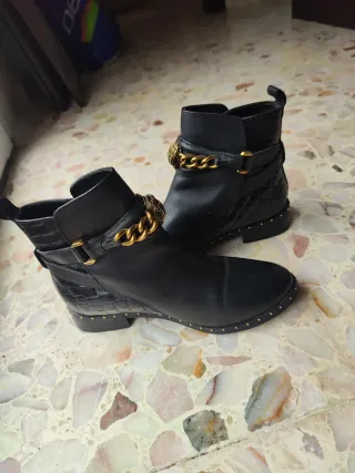 Botines negros con un diseño moderno y detalles llamativos. - Cierre de cordones. - Detalle de hebilla dorada. - Suela gruesa con plataforma. Preguntad por tallas