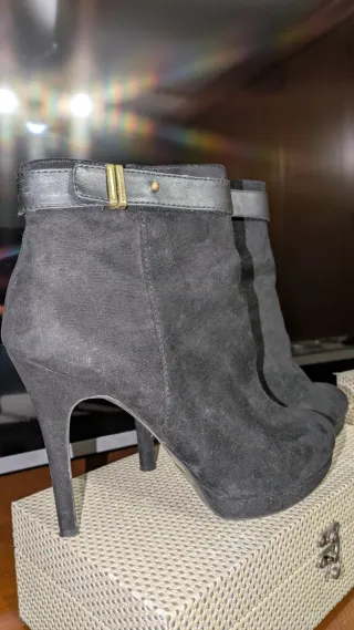 Botines de tacón alto con plataforma. - Material exterior tipo ante. - Tacón cuadrado y grueso. - Plataforma delantera. - Caña elástica. - Algún roce visible en las fotos