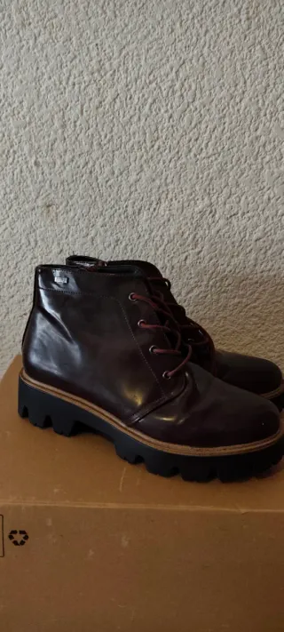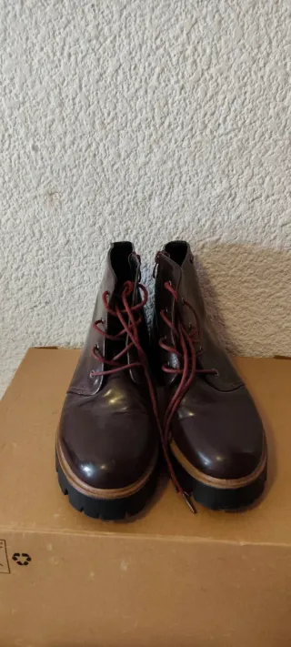 Botines de la marca Mustang en color burdeos/morado. Tienen un diseño moderno y elegante. - Cierre con cordones. - Cremallera lateral - Suela gruesa y resistente. - Detalle de etiqueta en el lateral Usadas tienen rozaduras en la parte interna de los talones como se ve en la foto