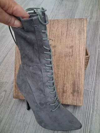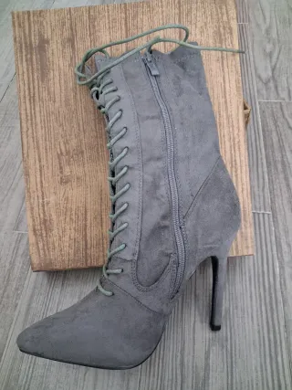 Botín de tacón alto con un diseño moderno y elegante. - Material tipo ante. - Cierre de cremallera lateral. - Cordones frontales para ajuste. - Punta fina.