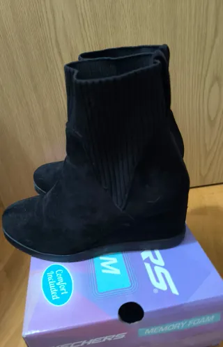 Botines de la marca Skechers en color negro y talla 37. Presentan un diseño moderno con parte superior elástica. - Material exterior tipo ante. - Parte superior de tejido elástico acanalado. - Suela con plataforma y cuña integrada.