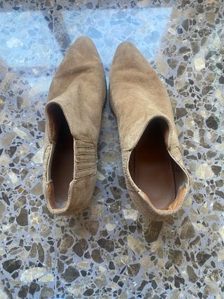 Botín peep toe de ante con suela de piel. Cuentan con un detalle de cremallera dorada en el lateral. Destalonadas. Muy cómodas gracias a la pequeña plataforma interior. Tacón 8 cms. Tienen 1 puesta. - Material exterior: Ante - Material suela: Piel - Diseño peep toe - Cierre de cremallera