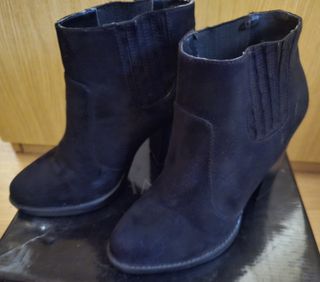 Botines de ante negros de la marca Guess. - Tacón alto y grueso. - Detalle dorado en el talón.