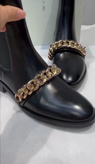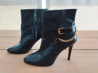 Elegantes botines de cuero con detalles dorados. - Material: Cuero - Color: Negro - Adorno de cadena dorada - Hebilla dorada - Tacón alto