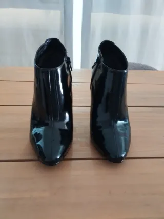 Botines de charol con tacón alto. - Color negro, sin roces. - tacón 8 cm. - Cómodos, de talle corto para llevar con vaqueros y faldas. - Diseño elegante y moderno. - Cierre de cremallera lateral. - Punta afilada.