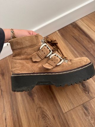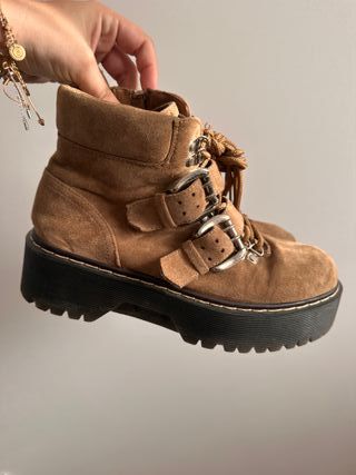 Botines de ante en color marrón con un diseño moderno y atrevido. - Cierre con cordones. - Dos hebillas metálicas decorativas. - Suela gruesa y dentada. 5 cm de altura.