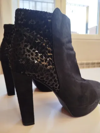 Elegantes botines con un diseño llamativo. - Detalle de lentejuelas brillantes en la parte trasera. - Tacón grueso y plataforma. - Material exterior tipo ante.