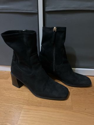 Botines de tacón alto con acabado en ante. - Diseño de punta fina. - Tacón fino y elegante. - Cierre de cremallera lateral, usadas solo en una ocasión.