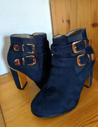 Botines de estilo moderno con detalles dorados. - Material tipo ante. - Cierre con cremallera lateral. - Doble tira con hebillas decorativas. - Tacón grueso con acabado metálico.