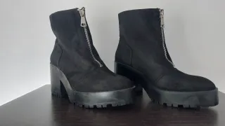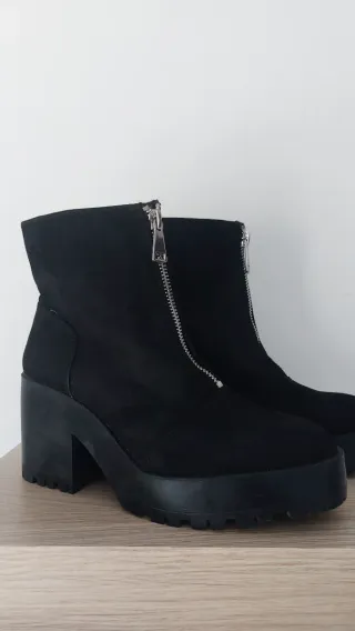 Botines negros con un diseño moderno y atrevido. - Material exterior de ante. - Cierre de cremallera frontal. - Suela de plataforma gruesa. - Tacón cuadrado alto.