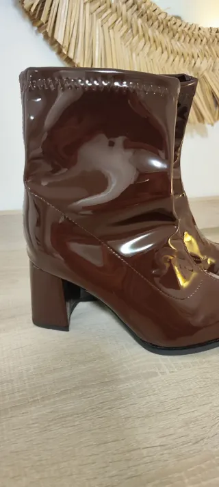 Botines de charol talla 39. Sin estrenar (no me sirven y no pude devolverlos). Color granate oscuro - Acabado brillante. - Tacón grueso. - Cierre de cremallera lateral.