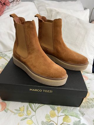 Botines de estilo Chelsea para mujer. - Material exterior de ante. - Forrados de pelo por dentro - Suela de goma con plataforma. - Diseño elástico en los laterales. - En la última foto se ve lo que me costaron, 86€