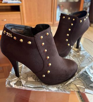 Botines con tacón y plataforma de Xti Con detalle de tachuelas doradas. Número 39 Color marrón En perfecto estado. Puestos solo un día. Solo tienen una marca en un tacón que apenas se aprecia (se ve en las fotos). Botines de tacón alto con un diseño moderno y atrevido. - Detalle de tachuelas doradas. - Cierre de cremallera lateral. - Tacón fino y plataforma delantera.