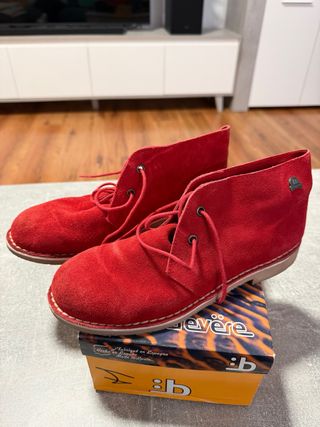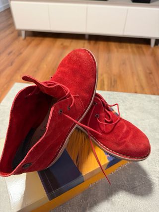 Botines de ante rojo con forro interior de felpa. - Cierre con cordones. - Suela de goma. - Detalle de costuras. ***TIENEN UNA PUESTA***