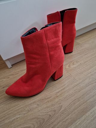 Botines de tacón alto con plataforma en color rojo. - Material exterior tipo ante. - Cierre lateral con cremallera. - Tacón fino y plataforma delantera.