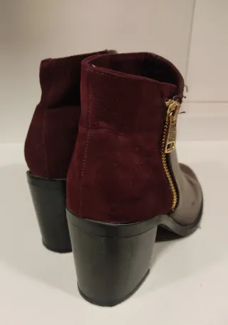 Botines tipo ante en color granate. - Cierre de cremallera lateral. - Tacón grueso. - Detalle de aro en la cremallera.