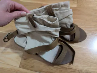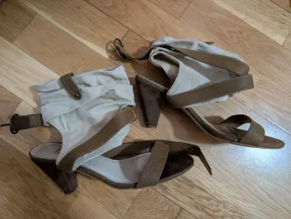 Botines de estilo casual con un diseño moderno y práctico. - Material exterior de ante. - Cierre de cordones y cremallera lateral. - Suela gruesa y resistente. - Color beige / marron - Talla 39 - Muy poco uso (2 veces). Están nuevas
