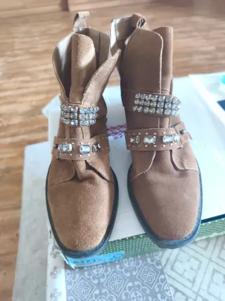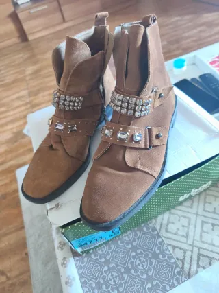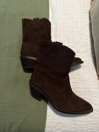 Botines de ante en color marrón, talla 39. Están completamente nuevos, sin estrenar. - Diseño tipo cowboy. - Tacón cuadrado.