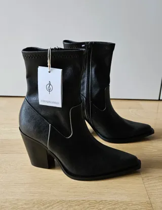 Botines estilo cowboy de Stradivarius. - Diseño de caña media. - Tacón grueso y cuadrado - Punta afilada. - Cierre de cremallera lateral. - Sin estrenar, con etiquetas