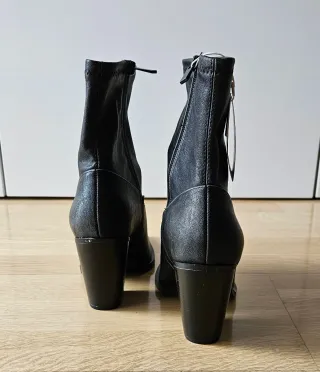 Botines de tacón con un diseño moderno y elegante. - Material exterior tipo ante. - Tacón grueso y cuadrado. - Cierre con cremallera en la parte trasera.