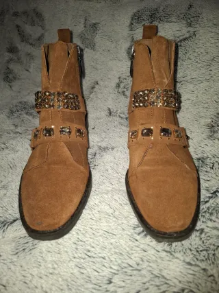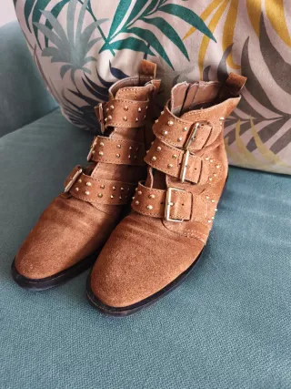 Botines con un diseño único. Talla 37. - Material exterior de ante. - Detalle de tachuelas doradas. - Tres correas con hebillas metálicas. - Cierre de cremallera lateral.