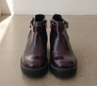 Botines de estilo moderno con detalles que marcan la diferencia. El color es tirando a burdeos/marrón Muy bonitos - Diseño con corte lateral. - Correa con hebilla metálica. - Suela de plataforma gruesa con buen agarre. - Acabado brillante.