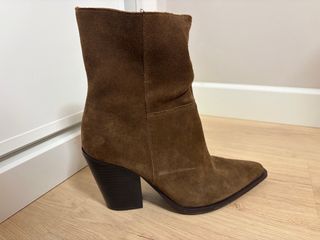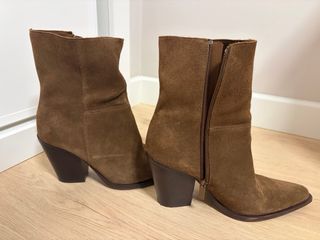 Botines de ante en color marrón. Un básico para tu armario. Puestos tres veces. Se ve estado y pequeño desperfecto en tacón. - Material: Piel ante. - Tacón: Bloque. - Punta: Fina.