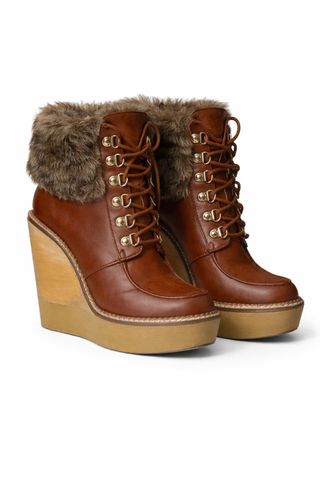 Botines de la marca Stradivarius en color marrón cuero con detalle de pelo en la parte superior. ✨ Diseño tipo montaña con cordones y herrajes metálicos. ✨ Cuña efecto madera muy estilizada. ✨ Plataforma delantera que equilibra la altura. 📏 Talla 37 👠 Tacón/cu ña: 12 cm Botín muy favorecedor, ideal para looks de otoño/invierno con jeans, vestidos o medias tupidas. Si necesitas más fotos o medidas, escríbeme sin compromiso 😊