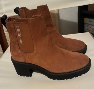 Botines de ante en color marrón, talla 38. Chelsea, sin cremallera. Con un diseño moderno y cómodo. Con plataforma y tacon ancho total 6,5 cms. Los he puesto 2 ratos - Material exterior de ante. - Suela de goma negra.