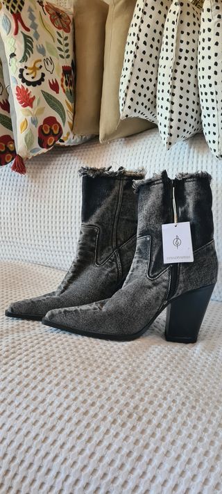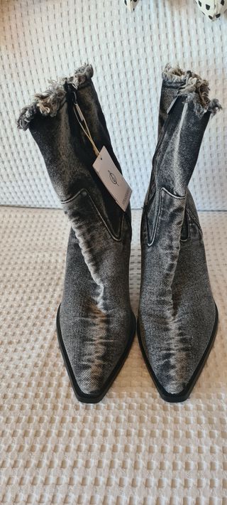 Preciosos Botines Cowgirl de Stradivarius con diseño media caña en Denim Black y tacón de 10 cm, talla 41, sin estrenar, con su etiqueta. Llevan un extra de filis y tapas antideslizantes de la mejor calidad (siempre se lo pongo a todos los zapatos para que duren), que de por sí cuestan veiticinco euros. - Diseño cowboy. - Material denim desgastado. - Detalle de flecos en acabado. - Cremalleras. - Muy cómodos.