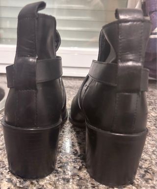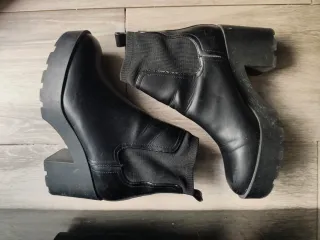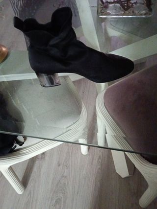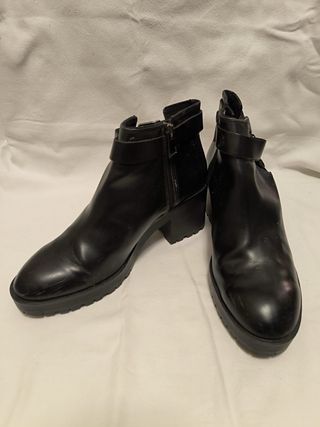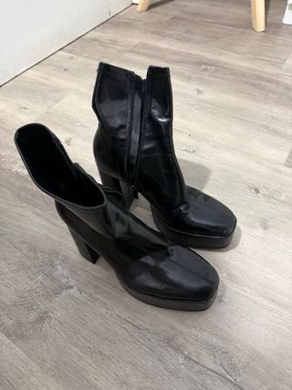 Botines con tacón y plataforma. - Diseño moderno y elegante. - Tacón grueso y cuadrado. - Plataforma delantera. - Cierre de cremallera. solo las he usado una vez, están perfectas.