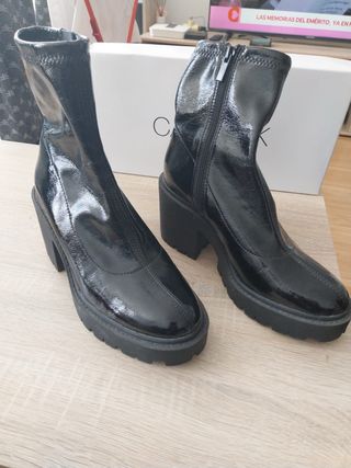 Botines de charol con plataforma y tacón grueso. - Cierre de cremallera lateral. - Punta redonda. - Suela track. - Diseño elástico en el tobillo.