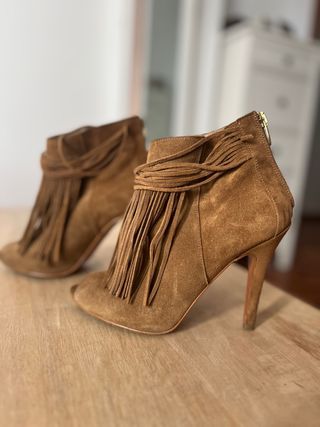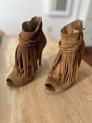 Botines de fiesta en ante con un diseño bohemio y elegante. Perfectos para añadir un toque especial a tu look. - Detalle de flecos largos. - Tacón alto y fino. - Cierre de cremallera en la parte trasera. - Punta abierta.