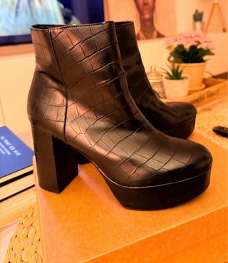 Botines de plataforma con un diseño moderno. Como se ve en la suela puestos solo una vez ya que me quedan pequeños y se me paso el ticket - Tacón grueso y robusto. - Suela con estrías para un mejor agarre. - Material sintético.