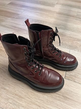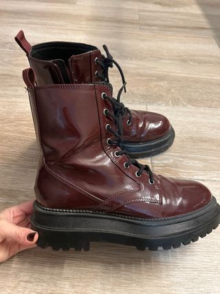 Botas de estilo militar con acabado charol. - Cierre con cordones. - Cremallera lateral. - Suela gruesa.