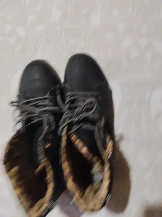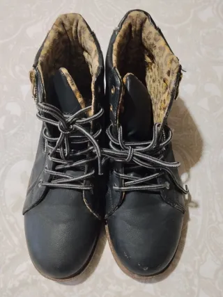 Botines negros con un diseño moderno y detalles llamativos. - Cierre con cordones para un ajuste seguro. - Forro interior con estampado de leopardo. - Cremallera lateral para facilitar su puesta.