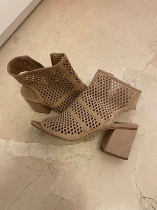 Preciosos botines de tacón beige, ideales para cualquier ocasión. Son de estilo peep-toe y presentan un diseño con perforaciones. Se encuentran en muy buen estado. - Tacón cómodo y elegante. - Diseño con abertura en la puntera. - Perforaciones decorativas. de regalo los botines negros