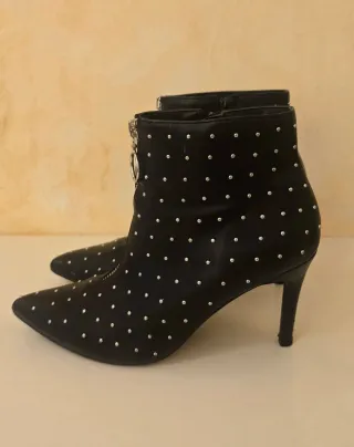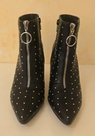 Botines de tacón fino con un diseño moderno y atrevido. - Acabado en color negro. - Detalle de tachas plateadas por toda la bota. - Cremallera frontal plateada con aro. - Punta fina. - Tiene una pequeña marca en los tacones nada perceptibles. -Comprobar suela (llevados en 2 ocasiones)