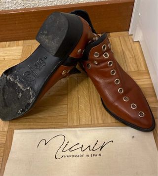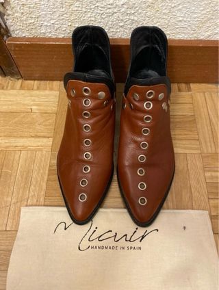 Botines de cuero y ante con un diseño moderno y detalles de tachas. - Material exterior: cuero y ante. - Color: marrón. - Detalle de tachas metálicas. - Diseño tipo chelsea con elásticos laterales. son de la marca miamicci, pone zara porque no encuentro la marca para poner