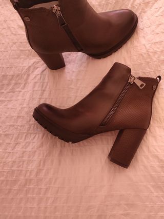 Botines de ante en color marrón. - Cierre con cremallera lateral. - Detalle de tiras en la suela. - Tacón alto.